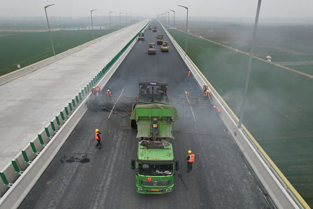 冒着热气的沥青混合料倾泻而下,浓烈的热浪扑面而来。七八台压路机紧随其后、来回穿梭,将滚烫的路面反复碾压、夯实平整,不一会儿,松软的沥青路面变得平整坚实。春光正好,战鼓催征。3月21日上午,兰原高速兰考
