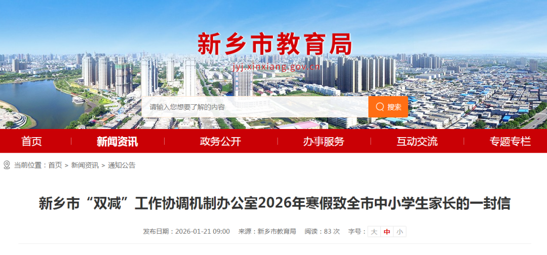 新乡市“双减”工作协调机制办公室2026年寒假致全市中小学生家长的一封信广大家长朋友们:2026年寒假将至,春节临近。为巩固“双减”成效,严防学科类培训“隐形变异”,规范非学科类培训,切实为学生减负,