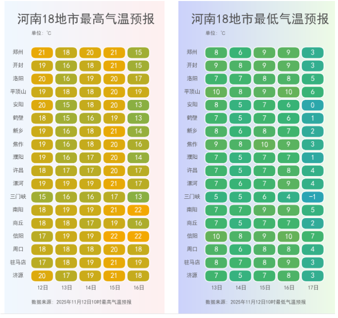 封丘县气象台2025年11月15日19时14分发布寒潮蓝色预警信号:预计18日凌晨较16日凌晨,我县所辖乡镇和街道最低气温将下降10℃以上,18日凌晨最低气温将降至零下3℃到零下2℃,16日有4到5级
