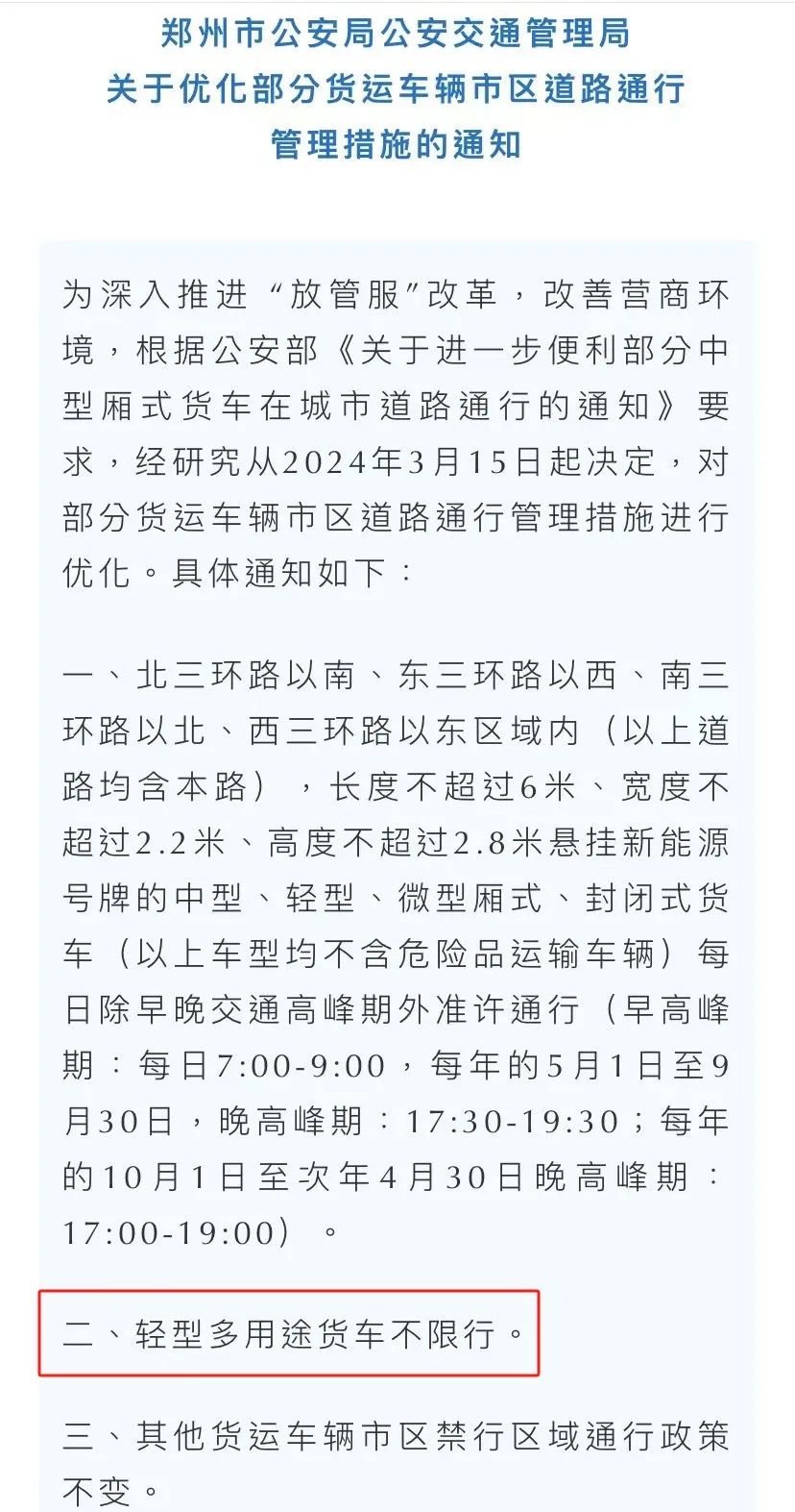 33月4日,郑州市公安局交通管理局发布《关于优化部分货运车辆市区道路通行管理措施的通知》,决定从2024年3月15日起,对部分货运车辆市区道路通行管理措施进行优化。