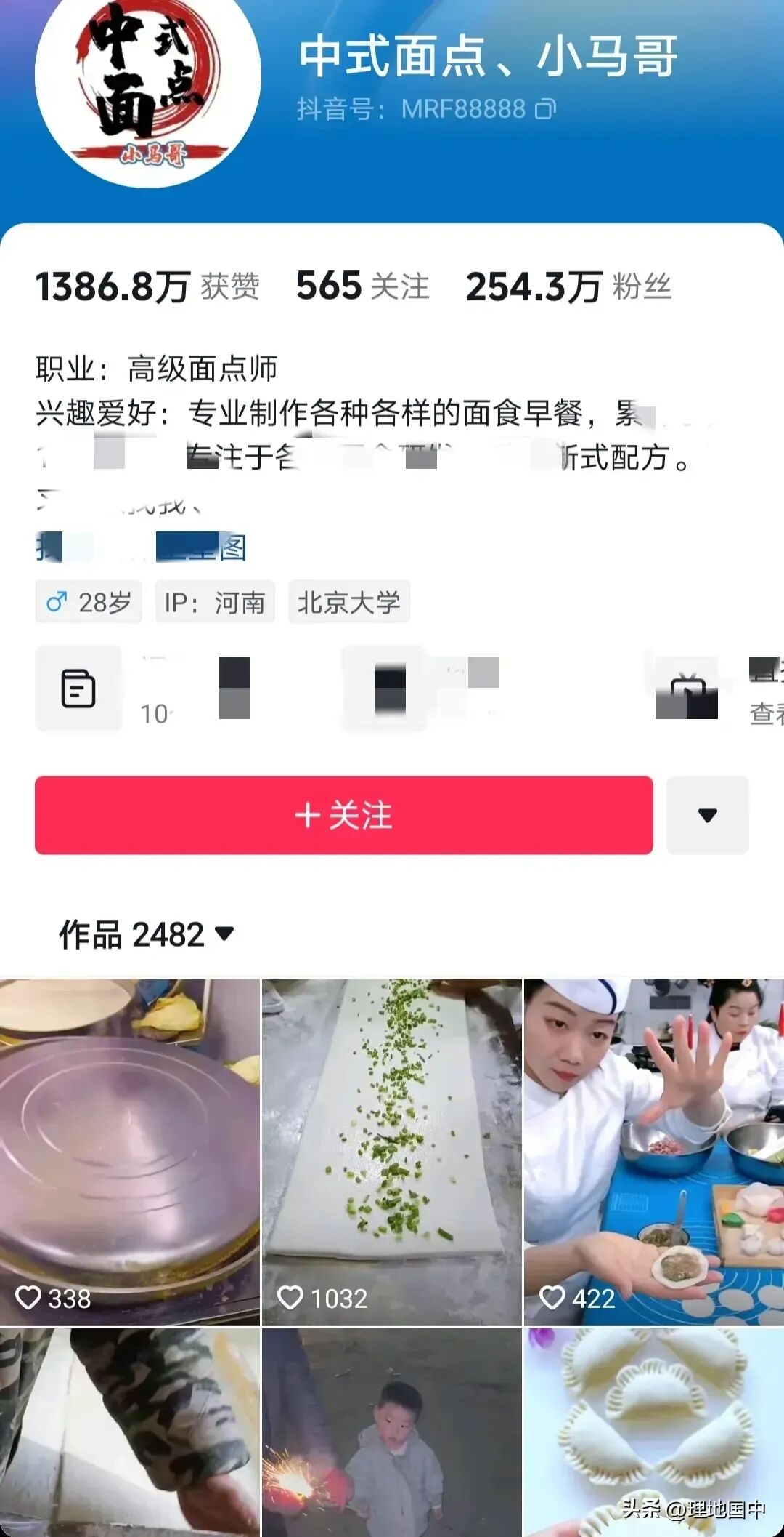 粉丝数254.3万,面点师傅,面粉在他手里就能变出各种各样的东西,视觉盛宴。