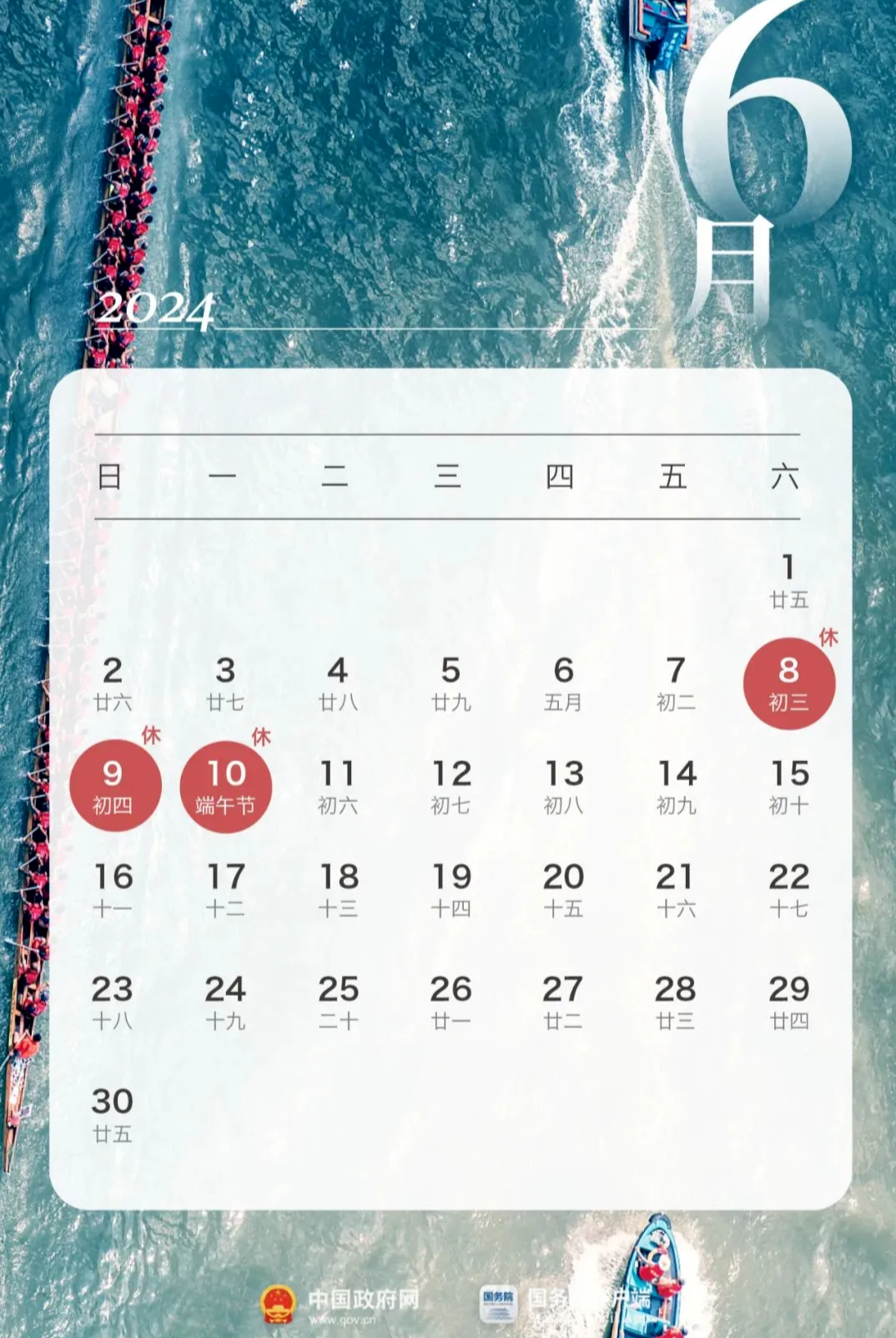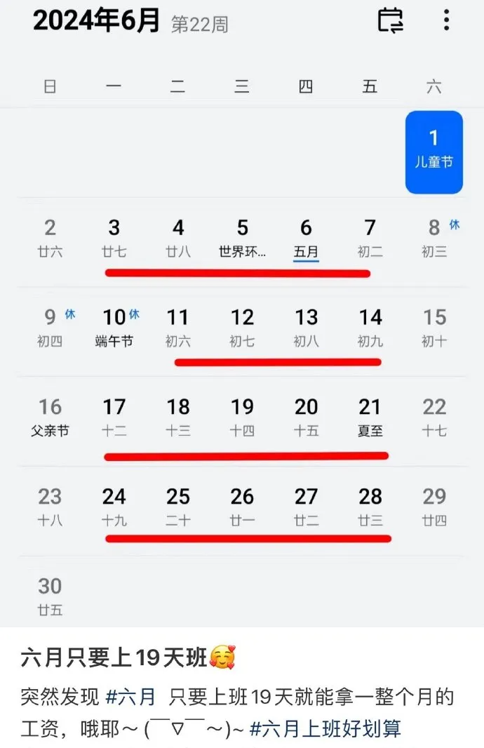 盼望着盼望着下一个假期就快要来了!6月8日至10日端午节假期共3天不调休!有网友发现惊喜消息六月只要上班19天就能拿一整个月的工资相关话题 #六月上班好划算# #突然发现六月只要上19天班# 更是冲上热搜引发广泛讨论 六月只用上19天班?根据网友的算法六月共有30天,去掉6月1日至2日、6月15日至16日6月22日至23日、6月29日至30日四个周末8天以及6月8日至10日端午假期3天最后剩下19个工作日对此有网友表示“很正常,不奇怪”端午假期高速免费吗?注意啦根据《国务院关于批转交通运输部等部门重大节假日免收小型客车通行费实施方案的通知》高速免费通行的时间范围为春节、清明节、劳动节、国庆节四个国家法定节假日所以端午节假期高速不免费哦!接下来今年还有哪些假期?☞中秋节9月15日至17日放假调休共3天9月14日(星期六)上班☞国庆节10月1日至7日放假调休共7天9月29日(星期日)10月12日(星期六)上班端午假期有出行需求的旅客请看这里!假期火车票即将开售!假期首日(6月8日)的车票将于5月25日正式开售放假前一天(6月7日)的车票将于5月24日正式开售计划在端午假期出行的旅客千万别忘记购票哦~请查收2024端午购票日历另外,可以提前开启起售时间提醒功能操作方法如下:①选择乘坐车次日期,点击【设置提醒】②选择出发车站,点击【添加提醒】端午假期你准备去哪儿玩?快来留言分享一下吧~