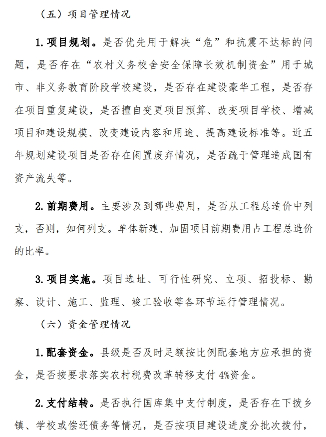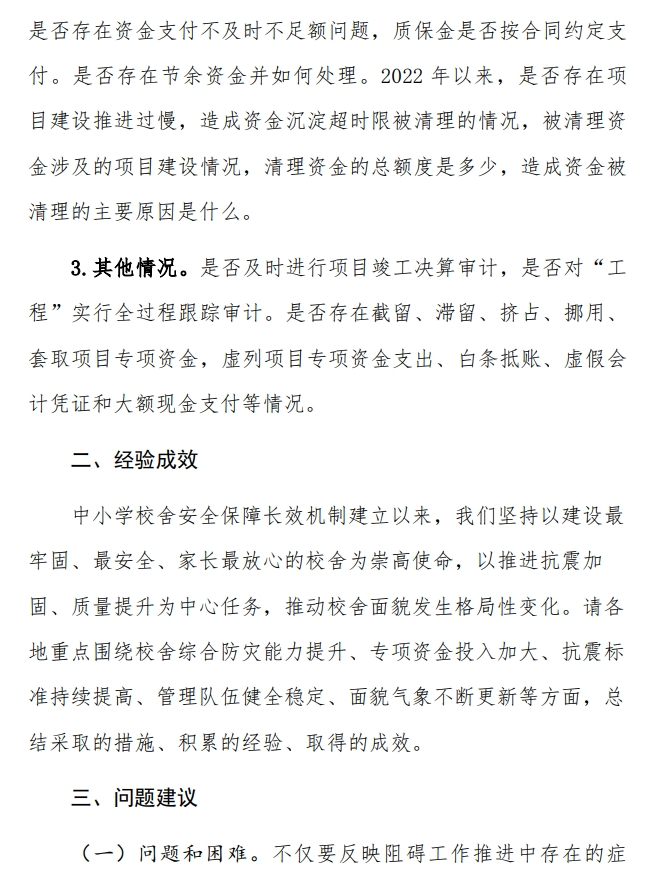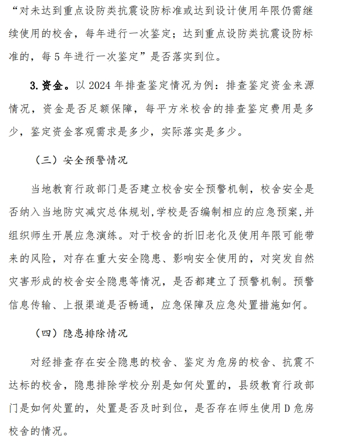 对教育行政部门调研的主要内容是:本地区中小学校舍的基本情况;指导本地区学校开展长效机制工作的主要举措;近三年本地区长效机制项目推进情况;近三年本地区不安全校舍消除情况;开展长效机制工作的经验、问题或困难;推进问题解决的意见和建议等。