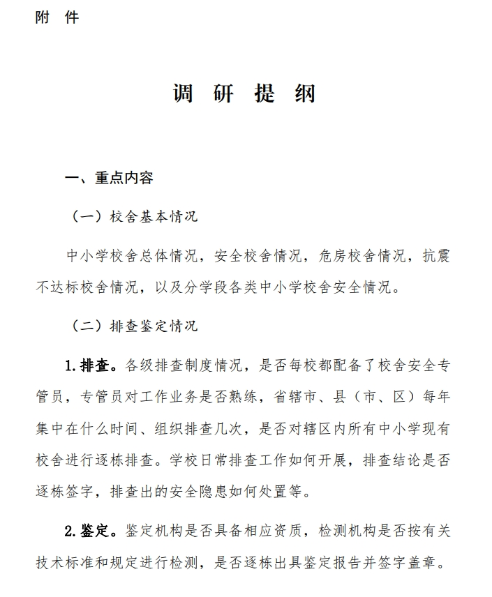 附件:调研提纲 1.中小学校舍基本情况调查表 2.中小学校舍排查鉴定情况调查表 2024年9月15日