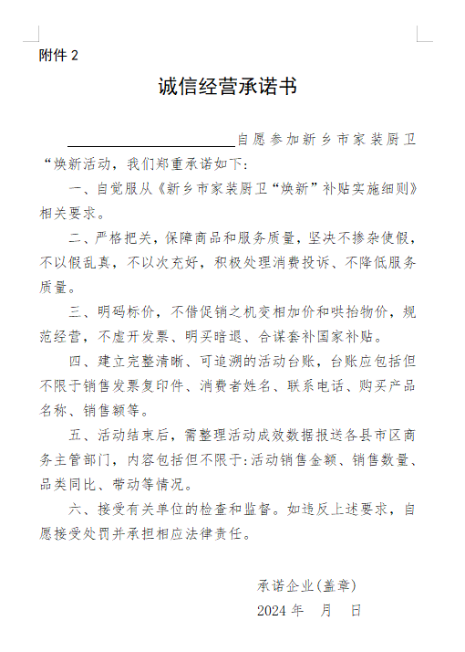 新乡市家装厨卫“焕新”补贴实施细则 根据国家发改委、财政部《关于加力支持大规模设备更新和消费品以旧换新的若干措施》(发改环资〔2024〕1104号)和省商务厅等8部门办公厅《关于印发河南省推动家装厨卫“焕新”实施方案的通知》(豫商运〔2024〕39号)要求,结合新乡市家装厨卫“焕新”工作实际,制定以下实施细则。 一、实施时间 自本细则印发之日起至2024年12月31日。 受预算总额控制,本次活动原则为“先到先得,用完即止”。补贴资金使用完毕后,新乡市商务局将于官方网站及时发布公告终止活动。若补贴活动终止公告发出前提交的补贴申请总金额超过补贴预算总金额,以申报审核通过时间先后顺序确定补贴对象。 二、补贴范围 净水机、蒸烤箱、微波炉、洗碗机、消毒柜、扫地机、智能马桶、智能门锁、淋浴器、智能窗帘、智能晾衣架、床、助听器、轮椅、餐桌餐椅、茶几、电视柜、沙发、床垫、衣橱柜(含定制)、浴室柜、水槽水龙头、浴霸等23类家装厨卫类产品。 三、补贴对象和标准 活动期间,对个人消费者在参与补贴政策的企业,购买以上家装厨卫类产品,按产品销售价格的15%给予补贴,单件补贴金额最高不超过1500元。每位消费者可任意领取5张优惠券,进行任意品类产品核销,消费者需在有效期内使用,过期失效。 四、参与销售企业 意向参与新乡市家装厨卫“焕新”活动的企业需向各县(市、区)商务主管部门报名,经各县(市、区)商务主管部门筛选后选定,报送至市商务局统一备案。参与企业需具备以下资质: 1.在我市从事本细则所列家装卫浴类、智能厨具类、适老化类、小家电类产品销售、能开具发票的企业,达限入库企业、培育企业优先。 2.资信状况良好,无不良记录,未被“信用中国”网站列为失信被执行人,近三年无重大安全事故,无违法违规行为。 3.具备防范骗补、套补等行为的能力,有规范的出入库管理机制和相关台账资料。 4.具备较强的用户和区域覆盖能力,具备送货、安装、调试、维修、逆向物流等售后服务能力,能按区域进行有效管理。 5.具备满足收银结算需求的设备条件,能安排相应工作人员,能及时处理消费者购新服务及退货申请,可及时退回补贴资金,并按要求正确处理有关信息材料。 6.能严格遵守本次活动规则,确保在补贴政策期内完成交货;不卖假货,不以次充好,不虚标价格,不接受预存和充值,不虚假交易等。 7.参与本次活动的销售企业应遵从本次活动规范和要求,签订诚信经营承诺书(附件2)。 五、消费者参与流程 1.实名认证。消费者登录“建行生活”APP填报个人基本信息,完成实名认证,并登录新乡市家装厨卫“焕新”专区,领取优惠券,获取补贴资格。 2.支付立减。消费者到参与商家选择对应品类的补贴优惠券核券购买商品,按照活动约定支付方式付款(每件产品应单独支付结算),开具销售发票(开票地须为新乡市行政辖区范围内,发票抬头为个人姓名,开票金额应为“实际支付金额十政府补贴金额”),直接享受支付立减。商家门店及时上传商品销售发票等信息。 3.资金清算。参与商家原则上每半月向所属辖区商务主管部门提出商家立减补贴资金结算申请,各县(市、区)商务、财政主管部门审核确定,并将审核通过的商家及补贴资金情况报市商务局、财政局审核,市商务局、财政局根据审核结果向商家拨付补贴结算资金。 发生消费者退货情形的,商家必须通过原支付渠道退还消费者实际支付金额(不包含补贴资金)。否则将依法依规严肃处理。如退货发生在财政补贴资金向商家拨付以后,由商家及时将与退货相关的补贴资金退还。全额或部分退货退款均占用消费者的一次补贴资格。 其他活动规则详询服务平台或查阅平台公告信息;商家自主促销优惠政策详询参与商家。 六、相关要求 (一)各县(市、区)商务主管部门要做好家装厨卫销售商家的遴选确定,加强巡查、暗访,督导商家规范参加活动,按照实施情况动态调整;在防控风险的前提下提高审核效率,减轻参与商家垫资压力;做好活动宣传发动、政策解读、组织服务、数据统计等工作,及时报送经验做法。 (二)各县(市、区)财政部门要配合商务主管部门做好资金测算、资金拨付、监控预警、监督核查等工作,承担审核中产生的审计及其他相关费用,保障家装厨卫“焕新”审计、审核等方面顺利开展。 (三)各县(市、区)市场监管部门负责加强家装厨卫产品质量和价格监管,依法查处价格欺诈等违法行为,切实维护消费者合法权益。 (四)各县(市、区)公安部门负责对活动中涉嫌公安管辖范围内犯罪的依法严厉打击,切实保障国家政策落实到位。 (五)服务平台要做好活动宣传推广,积极采取有效技术手段,提高活动的便利性、安全性,及时发现并移交涉嫌违法违规行为,有效防范风险。配合做好后续业务及资金审计等工作。 (六)各参与活动商家要强化主体责任,规范经营行为,兑现优惠承诺,及时妥善处理消费投诉。对有变相加价、不兑现优惠承诺、消极处理消费投诉等行为的商家,取消活动参与资格;情节严重的依法追究相应法律责任。 (七)消费者和商家均不得提供虚假信息或者设置虚假交易骗取补贴资金。如存在违法违规行为,取消参与资格,情节严重的依法追究相应法律责任。 (八)消费者如需咨询本细则有关内容,或者查询相关申请办理方式、审核状态及办