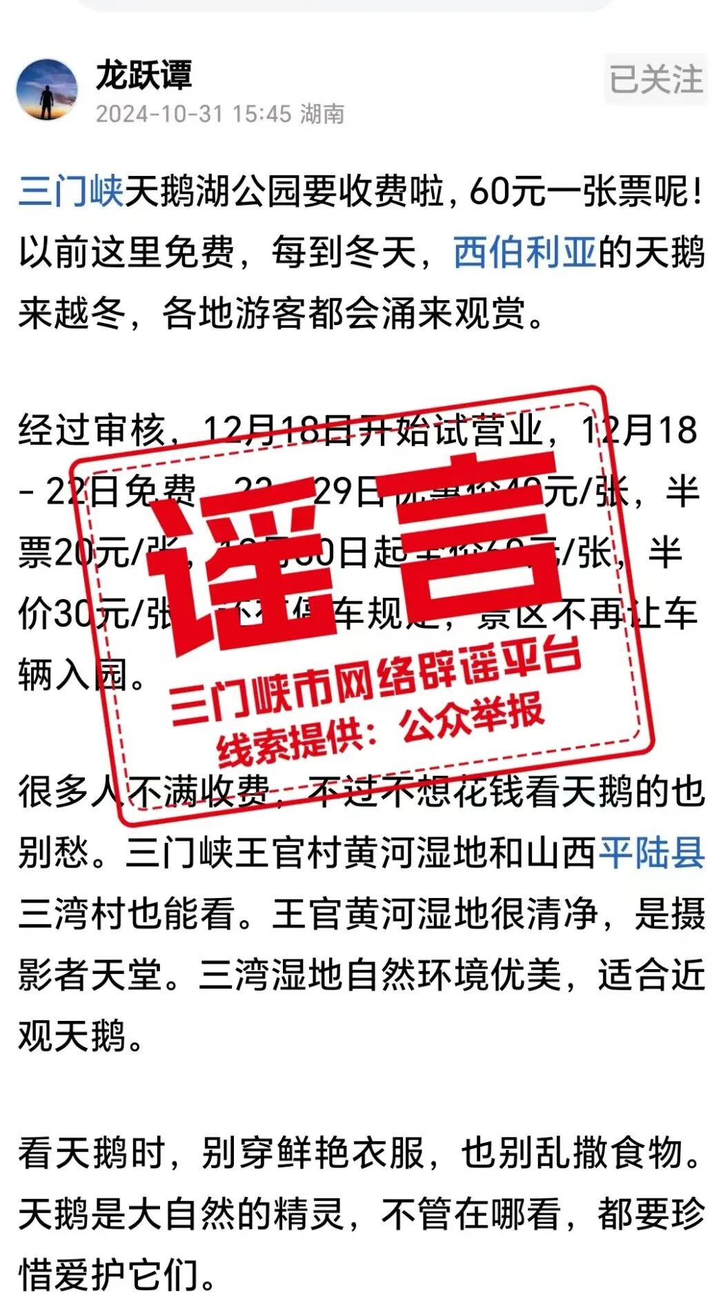 10月,我省持续做好涉社会民生、校园安全、农业农村等网络谣言的发现辟除,加大谣言打击力度,着力营造清朗网络空间。现对6起典型案例予以公布。 ●谣言一:新乡家电“以旧换新”国补资金用完政策暂停? 真相>> 10月26日,有网民在多平台发布关于“全国首个!新乡家电以旧换新国补资金用完政策暂停”的文章,声称“国补末班车即将结束”“中央财政9000万补贴资金已经用完”等内容。经查,该信息系谣言,相关视频已删除! (来源:新乡市委网信办) ●谣言二: 网传“焦作市中站区事业单位招录300人,公告即将发布”? 真相>> 10月10日,接网民举报,短视频账号@焦作考编小助手发布信息称“中站区事业单位招录300人,公告即将发布”,引发关注。经查证,该信息内容不实,系自媒体账号主办者为博取关注、吸引流量而制作发布。当地网信部门对该自媒体账号主办者进行了批评教育,其已主动删除相关信息。(来源:焦作市委网信办) ●谣言三:网传“河南新乡秋收不让扬尘”? 真相>> 10月11日,接网民举报,网络账号“蛤蜊视频”发布视频并配文称“河南新乡,秋收可以不能扬尘”,引发网络关注。经查证,网传信息不实,事发地非新乡,相关视频系使用异地音视频嫁接拼凑而成,相关视频已删除!(来源:新乡市委网信办) ●谣言四:网传“驻马店泌阳县一女生被多人霸凌”? 真相>> 近日,有网络账号发布一则“女生在厕所被多人霸凌”视频,并标注“河南泌阳”字样。经过对泌阳全县初、高中及中等职业技术学校全面排查,均不存在视频所述霸凌事件,网传信息不实,相关视频已删除!(来源:网信驻马店) ●谣言五:网传“三门峡天鹅湖公园要收费”? 真相>> 10月31日,网络用户“龙跃谭”在某平台发布信息称:“三门峡天鹅湖公园要收费啦,60元一张票”,经三门峡市网信部门查证,网传天鹅湖公园收费为谣言,发布者主动删除了不实信息视频。(来源:三门峡市委网信办) ●谣言六:网传“河南濮阳地震”? 真相>> 10月15、16日,网络账号为“濮阳妃儿”“婷ting菇凉”在网络平台发布“下午4点12分濮阳户部寨地震了”“濮阳的朋友们3点39分是不是地震啦”等信息。经濮阳市委网信办向濮阳市防震减灾中心核实,10月15、16日濮阳市辖区内未发生地震,网传信息为谣言!经属地网信办工作人员批评教育,发布者主动删除了不实信息视频。(来源:濮阳市委网信办) 在此郑重提醒广大网民,互联网不是法外之地,请自觉遵守法律法规,不造谣、不信谣、不传谣。如发现网络谣言线索,欢迎您向河南省互联网违法和不良信息网站举报,共同维护清朗网络空间! 来源:清朗河南