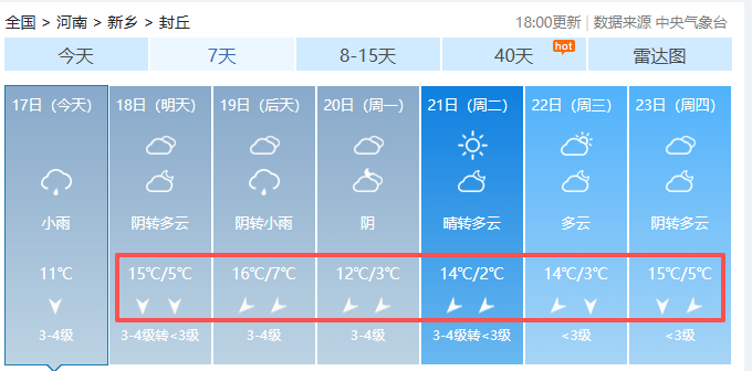 河南省气象台监测显示, 目前一个强大的冷高压中心 正盘踞在贝加尔湖南侧, 并不断向南输送冷空气。 预计从今天(17日)到20日, 这股实力不俗的冷空气 将持续影响河南省, 一场剧烈的 大风降温天气过程 正式拉开序幕。 中午时分,除西部、东南部外,河南大部雨势依旧较大。预计随着低槽的缓慢东移,今天下午强降水将逐步向东、向南推进,大部地区以中到大雨为主,中东部、南部部分地区有暴雨。预计今天夜间,暴雨核心区将逐渐移出河南,明天白天,降水范围将迅速收缩,仅西部、南部有零星小雨。这个周末(尤其是周六白天),不少地方的朋友又能与阳光重逢啦~ 此外,由于本次降水过程累计雨量较大,需警惕山区地质灾害的发生。今天上午河南省自然资源厅、河南省气象局联合发布地质灾害气象风险预警:预计17日8时至20时,郑州大部,南阳北部、中西部、及东南部,驻马店西部,洛阳北部局部,平顶山中南部及东南部,三门峡中北部,信阳西部及北部局部,发生地质灾害的风险较高,注意防范。 19日到21日, 全省的最低气温 将大面积跌破个位数。 21日凌晨, 今年下半年以来 最冷的一个早晨即将“上线”, 西部、北部地区 预计仅有0-4℃, 其他地区也只有5-7℃。 大风降温明显 后期回升乏力 受冷空气持续影响,预计今天到下周一,全省大部伴有4级左右的偏北风,阵风6-7级。与此同时,全省气温将继续下滑,较前期下降6-10℃:尤其是下周一(20日),全省大部最高气温不足15℃,西部多地更是会降至10℃以下。随后受冷空气持续扩散影响,气温回升幅度有限,大家要注意保暖,及时调整穿衣节奏。 本轮冷空气影响范围广、 持续时间长, 冷暖转换剧烈, 公众需及时增添衣物, 防范气温骤降可能引发的 呼吸系统和心脑血管疾病。