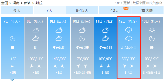 河南即将经历一次剧烈的气温波动。继昨天(12月6日)北部部分地区最高气温达到20℃后,未来一周气温将持续下降,预计到下周末最高气温降至2℃左右。整个过程由两轮冷空气推动,第二轮强度更大,并可能带来今冬首次大范围降雪。 第一轮弱冷空气今天(12月7日)已经开始影响我省。今天下午到明天,全省风力将增至3到4级,中西部、西北部阵风可达6级左右。气温随之下降,西部地区首先出现4-6℃的降温。到下周一(12月8日),降温将覆盖全省,大部分地区降幅4-6℃,中西部和北部部分地区降幅可达6-8℃。 这次降温过程短暂。从9日开始,气温将转为回升,预计到11日、12日,多地最高气温将重新回到15℃以上。 第二轮强冷空气预计在12月12日至13日抵达。这次冷空气影响范围广、降温剧烈,将导致气温从15℃以上的高点再次大幅下跌。 公众关注的降雪天气,在第二轮冷空气影响期间出现的可能性较大。根据气象资料分析,12日至13日,来自孟加拉湾和太平洋的水汽将同时向我国输送,中东部地区的水汽条件将明显改善。充足的水汽与强冷空气结合,具备了形成大范围雨雪的条件。 另外需要注意的是,近期我省天气干燥,风力较大,全省森林火险气象等级持续较高,东北部已达到高度危险级别。提醒公众注意野外用火安全,不要携带火种进入林区。气温起伏较大,请根据天气变化及时调整着装。 封丘天气 家人们一定要 及时增减衣物 以免感冒
