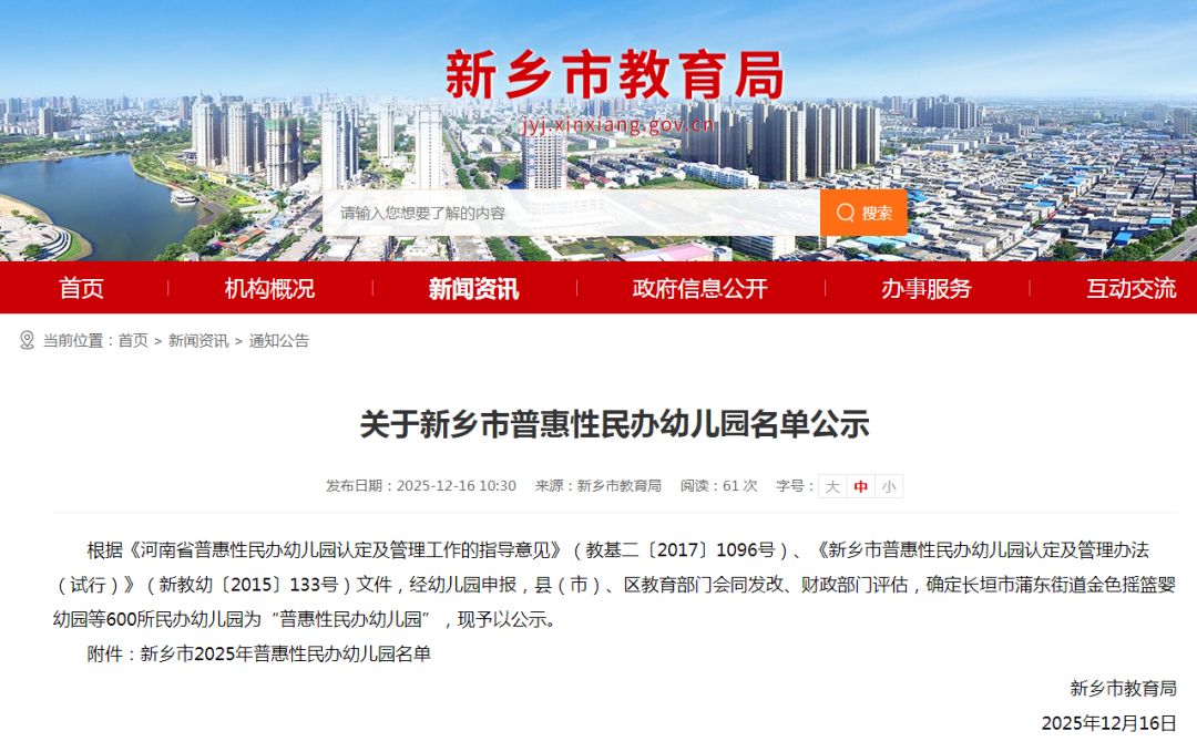 关于新乡市普惠性民办幼儿园名单公示 根据《河南省普惠性民办幼儿园认定及管理工作的指导意见》(教基二〔2017〕1096号)、《新乡市普惠性民办幼儿园认定及管理办法(试行)》(新教幼〔2015〕133号)文件,经幼儿园申报,县(市)、区教育部门会同发改、财政部门评估,确定长垣市蒲东街道金色摇篮婴幼园等600所民办幼儿园为“普惠性民办幼儿园”,现予以公示。 附件:新乡市2025年普惠性民办幼儿园名单 新乡市教育局 2025年12月16日 附 件 新乡市2025年普惠性民办幼儿园名单(封丘) 统计时间:2025年12月16日 序号 幼儿园名称 负责人 幼儿园地址 文件号 1 封丘县留光镇毅志幼儿园 聂法明 留光镇留光村西大街路南 封教体通〔2018〕151号 2 封丘县陈固镇天之乐幼儿园 姚玉巧 封丘县陈固镇 封教体通〔2018〕151号 3 封丘县王村乡金摇篮幼儿园 臧爱巧 城关镇幸福路北段世纪大道南 封教体通〔2018〕151号 4 封丘县王村乡快乐宝贝幼儿园 李 勇 封丘县王村乡三里庄村 封教体通〔2018〕151号 5 封丘县应举镇青苹果幼儿园 何亚敏 封丘县应举镇南关屯村 封教体通〔2018〕151号 6 封丘县应举镇红星幼儿园 遆好云 封丘县应举镇东大村 封教体通〔2018〕151号 7 封丘县应举镇阳光幼儿园 潘春岭 封丘县应举镇西马房村 封教体通〔2018〕151号 8 封丘县冯村乡阳光贝尔幼儿园 史万英 封丘县冯村乡大李庄 封教体通〔2018〕151号 9 封丘县城关镇城东幼儿园 杨济玲 封丘县城关镇振兴路1221号 封教体通〔2018〕151号 10 封丘县鲁岗镇阳光宝贝幼儿园 李 艳 封丘县鲁岗镇齐寨村 封教体通〔2018〕151号 11 封丘县陈桥镇芳草地幼儿园 张如雄 封丘县陈桥镇三合村 封教体通〔2018〕151号 12 封丘县城关镇文化路乐成幼儿园 王立珍 封丘县城关镇文化路 教办函〔2019〕73号 13 封丘县城关镇封化幼儿园 郝国香 封丘县城北干道2147号 教办函〔2019〕73号 14 封丘县冯村乡东韩丘村未来星幼儿园 姚彩霞 封丘县冯村乡东韩丘村 教办函〔2019〕73号 15 封丘县城关乡童星幼儿园 陈爱芹 封丘县城关乡水车里村 教办函〔2019〕73号 16 封丘县城关乡金太阳幼儿园 雷瑞莲 封丘县城关乡前、后葛塔交界处 教办函〔2019〕73号 17 封丘县王村乡金宝贝幼儿园 王世英 封丘县王村乡 教办函〔2019〕73号 18 封丘县应举镇獐鹿市村童心幼儿园 冯亚楠 封丘县应举镇獐鹿市村 教办函〔2019〕73号 19 封丘县城关镇小红帽幼儿园 孙士霞 封丘县黄池路中段 封教体通〔2020〕30号 20 封丘县城关镇自由路童年故事幼儿园 唐立红 封丘县城关镇自由路411号 封教体通〔2020〕30号 21 封丘县城关镇前北场村小群英幼儿园 贾瑞雪 封丘县城关镇前北场村 封教体通〔2020〕30号 22 封丘县城关镇府南路封化幼儿园 郝国香 城关镇府南路228号 封教体通〔2020〕30号 23 封丘县城关镇佳联春天幼儿园 高玉杰 封丘县城关镇佳联国际小区 封教体通〔2020〕30号 24 封丘县陈桥镇何家铺村小群英幼儿园 李文兰 陈桥镇何家铺村 封教体通〔2020〕30号 25 封丘县城关镇未来星幼儿园 焦凯云 封丘县城关镇工业路 封教体通〔2020〕46号 26 封丘县城关乡汪寨村爱晚亭幼儿园 汪义军 城关乡汪寨村 封教体通〔2020〕46号 27 封丘县城关镇娃哈哈文苑幼儿园 曹永华 文化路北段文苑小区 封教体通〔2020〕46号 28 封丘县潘店镇巨岗村翰林幼儿园 王素征 封丘县潘店镇巨岗村 封教体通〔2021〕64号 29 封丘县赵岗镇孙湾宝宝幼儿园 秦旭旭 赵岗镇孙湾村 封教体通〔2021〕64号 30 封丘县黄德镇南于村博源幼儿园 王世华 黄德镇南于村北 封教体通〔2021〕64号 31 封丘县黄德镇智多星幼儿园 郑彩勤 黄德镇大关村村北 封教体通〔2021〕64号 32 封丘县王村乡晨星幼儿园 王丽娜 封丘县封黄路 封教体通〔2021〕64号 33 封丘县城关乡娄堤乐慧幼儿园 车玉花 封丘县城关乡娄堤村 封教体通〔2023〕61号 34 封丘县居厢镇纪店村金色童年幼儿园 周永军 封丘县居厢镇纪店村 封教体通〔2023〕61号 35 封丘县尹岗镇东杨庄村爱尚幼儿园 张贺静 封丘县尹岗镇东杨庄村 封教体通〔2023〕61号 36 封丘县黄德镇黄德村育英幼儿园 王瑞红 封丘县黄德镇黄德村 封教体通〔2023〕61号 37 封丘县留光镇合城村育博幼儿园 戚志青 封丘县留光镇合城村 封教体通〔2023〕61号 38 封丘县潘店镇油坊村小天才幼儿园 管云玲 封丘县潘店镇油坊村 封教体通〔2024〕85号 39 封丘县赵岗镇蓓蕾幼儿园 惠祥红 赵岗镇纸坊村 封教体通〔2024〕85号 40 封丘县赵岗镇赵岗村金色童年幼儿园 李 锦 赵岗镇赵岗村 教办函〔2025〕174号 41 封丘县赵岗镇春雨幼儿园 陈利荣 封丘县赵岗镇马道村 教办函〔2025〕174号 42 封丘县城关镇爱尚幼儿园 高玉杰 封丘县城关镇为民路 教办函〔2025〕174号 43 封丘县城关镇世纪大道晨阳幼儿园 齐 静 城关镇世纪大道西段路南 教办函〔2025〕174号 44 封丘县城关镇翟母路博士幼儿园 赵 曼 封丘县城关镇翟母路 教办函〔2025〕174号 45 封丘县城关镇超智力幼儿园 刘红艳 封丘县城关镇西关村 教办函〔2025〕174号 46 封丘县城关镇郎朗幼儿园 李思波 城关镇世纪大道西段路南 教办函〔2025〕174号 47 封丘县荆隆宫乡荆南村宝贝幼儿园 张九艳 封丘县荆隆宫乡荆南村 教办函〔2025〕174号 48 封丘县荆隆宫乡大王庄村兴业幼儿园 秦梦姣 封丘县荆隆宫乡大王庄村 教办函〔2025〕174号 49 封丘县居厢镇冉固村小叮当幼儿园 杨凤