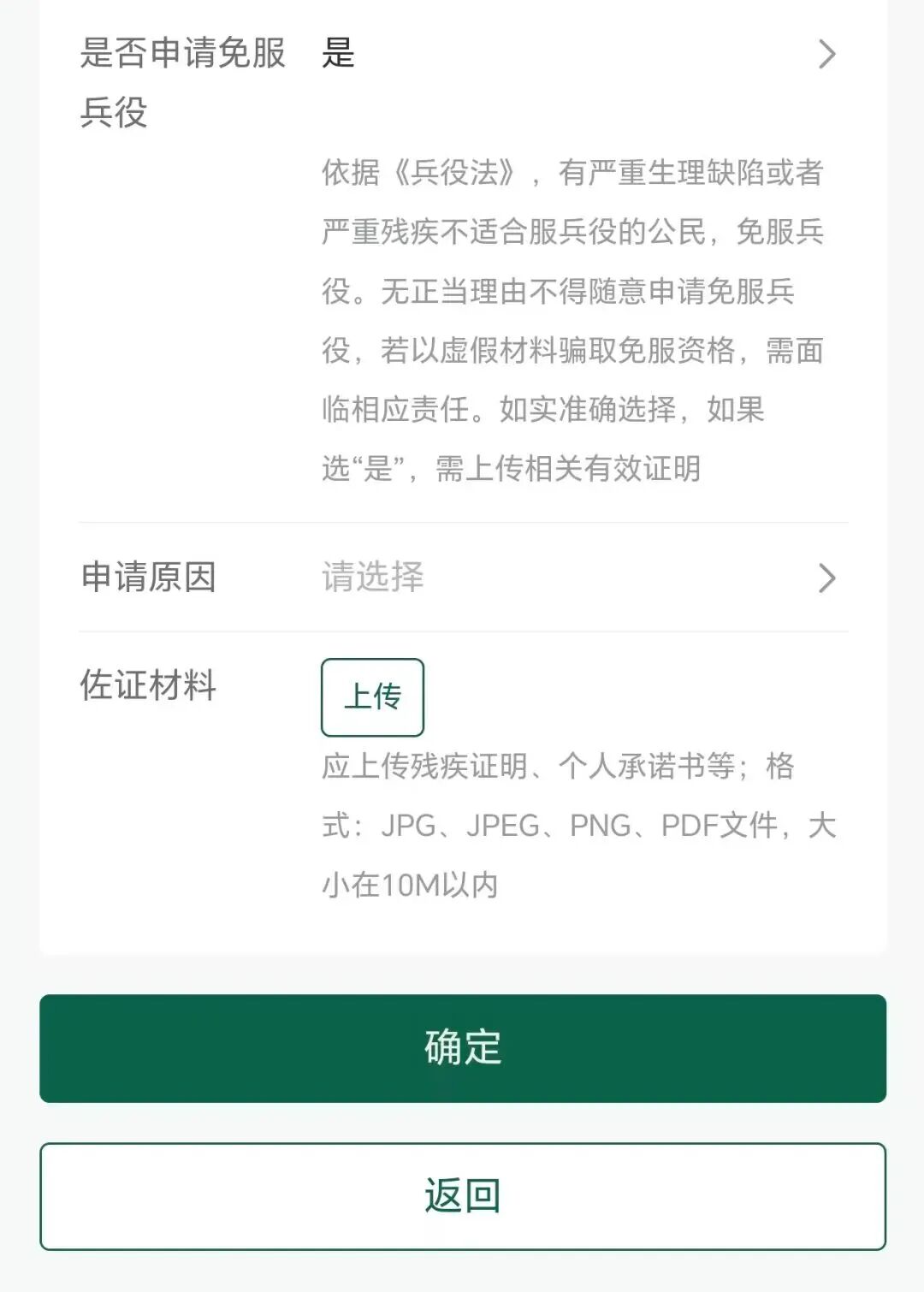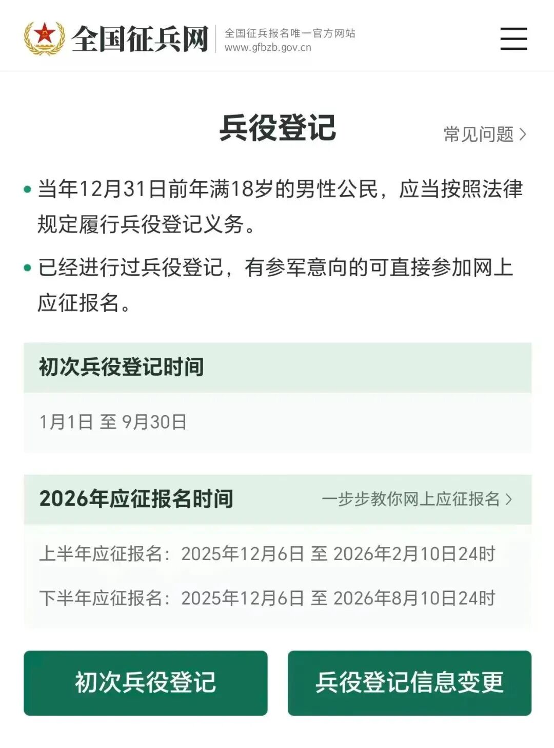 《中华人民共和国兵役法》规定“国家实行兵役登记制度。兵役登记包括初次兵役登记和预备役登记。每年十二月三十一日以前年满十八周岁的男性公民,都应当按照兵役机关的安排在当年进行初次兵役登记”。进行兵役登记是法律赋予每个适龄男性公民应尽的光荣义务和神圣责任,应自觉按时进行登记或核对。2025年12月15日,国务院和中央军委办公厅最新发布《兵役登记工作规定》,自2026年1月1日起施行。根据《中华人民共和国兵役法》《征兵工作条例》《兵役登记工作规定》和《河南省征兵工作条例》,现将封丘县2026年度兵役登记有关事项公告如下: (1)2026年12月31日前年满18周岁(2008年1月1日-2008年12月31日出生)男性公民,均应参加兵役登记。 (2)2026年12月31日前,年满17周岁未满18周岁的男性公民,本人自愿应征的,或者当年上大学需领取《兵役登记证》的,也可参加兵役登记。 (3)未超过24周岁(截至2026年12月31日前)男性公民没有参加兵役登记的,均应进行补登。 2026年1月1日起,至2026年10月31日。 (1)首次兵役登记的,可登录全国征兵网进行网上登记。兵役机关会为完成初次兵役登记的公民出具电子兵役登记凭证。确有需要的,也可以出具纸质兵役登记凭证,电子和纸质兵役登记凭证具有同等效力。 (2)公民因身体等特殊原因不能自主完成登记的,可以委托其亲属代为登记,户籍所在地乡、民族乡、镇的人民政府以及街道办事处应当核实相关情况,并协助完成登记。 (3)往年(2025年11月30日以前)已参加兵役登记,且年龄在24周岁以内的,无论是否应征报名,都需要再登录“全国征兵网”对个人兵役登记信息进行核验,家庭信息、学业信息和联系电话有变化的应及时修改。 《中华人民共和国兵役法》第五十七条规定,有服兵役义务的公民有下列行为之一的,由县级人民政府责令限期改正;逾期不改正的,由县级人民政府强制其履行兵役义务,并处以罚款: (一)拒绝、逃避兵役登记的; (二)应征公民拒绝、逃避征集服现役的; (三)预备役人员拒绝、逃避参加军事训练、担负战备勤务、执行非战争军事行动任务和征召的。 有前款第二项行为,拒不改正的,不得录用为公务员或者参照《中华人民共和国公务员法》管理的工作人员,不得招录、聘用为国有企业和事业单位工作人员,两年内不准出境或升学复学,纳入履行国防义务严重失信主体名单实施联合惩戒。 第五十九条规定,机关、团体、企业事业单位组织拒绝完成本法规定的兵役工作任务的,阻挠公民履行兵役义务的,或者有其他妨害兵役工作行为的,由县级以上地方人民政府责令改正,并可以处以罚款;对单位负有责任的领导人员、直接负责的主管人员和其他直接责任人员,依法予以处罚。 《征兵工作条例》第六十七条规定,有服兵役义务的公民拒绝、逃避兵役登记的,应征公民拒绝、逃避征集服役的,依法给予处罚。 《兵役登记工作规定》第二十八条规定,对未按照本规定要求进行兵役登记工作的相关单位或者个人,依照《中华人民共和国兵役法》、《中华人民共和国预备役人员法》、《征兵工作规定》等法律法规的规定处理,视情况纳入单位或者个人信用记录,由县级以上地方人民政府兵役机关和有关部门按照职责分工具体执行。 兵役登记是一项强制性制度,无论参军与否,适龄男性公民都应进行兵役登记。不进行、逃避或拒绝兵役登记的公民,将追究法律责任,影响升学、就业、考公、出国等! 第一步:在浏览器中输入“全国征兵网”,点击“兵役登记(男兵)”; 第二步:点击“初次兵役登记”; 第三步:已在学信网注册过“账号”的直接输入账号密码,点击“登录”即可; 第四步:未注册过“学信网”的,点击“注册”; 第五步:填写框内带*的全部内容,点击“立即注册”; 第六步:点击“立即登录”; 第七步:点击“征兵报名”; 第八步:点击“兵役登记(男兵)”; 第九步:进入登记的本人主页,按要求填写个人信息,主要登记公民的姓名、户籍地、公民身份号码、毕业(就读)学校、联系方式、住址等信息。登记信息必须详实。 第十步:最后就是2026年新增的一项内容——“是否申请免服兵役”,如果身体健康的填“否”,就是符合服兵役条件,当然兵役机关不会强制你去报名入伍。如果个人有服兵役意愿,需要在“义务兵征集”菜单里继续申请才能报名参军; 第十一步:如果身体有缺陷或者残疾的,选择“是”: 郑重提醒:在申请原因里选择下图中的伤残等级或者残废等级(最新兵役登记工作规定明确:政府有关部门对依照法律被剥夺政治权利的公民,应当作出不得服兵役的结论;对被鉴定为一级至四级伤残或者完全丧失劳动能力,或者被评定为一级至三级残疾等级的公民,应当作出免服兵役的结论。)如有下面的身体情况请按相应级别填写,当然必须上传“佐证材料”(附个人承诺书模版): 第十二步:如果登记完成后,请点击最下面的“确定”就可以了。 最后,兵役机关会为完成初次兵役登记的公民,出具电子兵役登记凭证;确有需要的,也可以出具纸质兵役登记凭证。电子兵役登记凭证和纸质兵役登记凭证具有同等效力。 进行兵役登记后,如果有意愿在2026年应征报名的,可在全国征兵网上直接进行2026年应征报名(手把手教你如何网上登记和报名)。也可以在下面时间段内,再次登录全国征兵网报名。应征报名时间上半年为2025年12月6日至2026年2