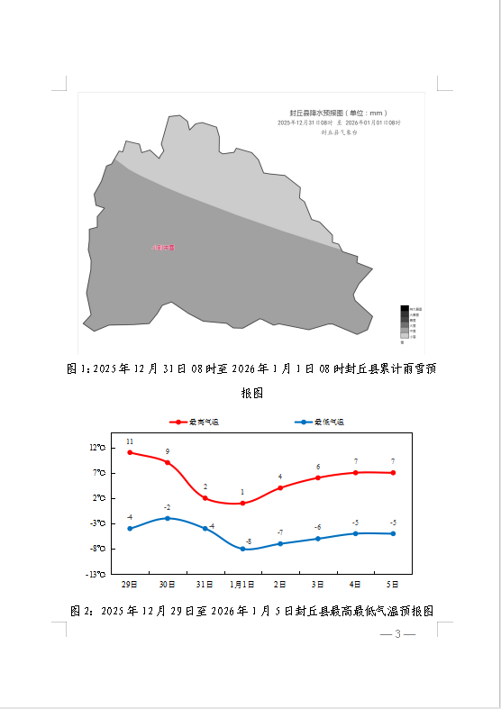 受西南暖湿气流和冷空气共同影响,31日我县有小到中雪,并伴有大风降温天气。过程累计降水量:2到4毫米;过程积雪深度:2到4厘米;主要雨雪时段为31日傍晚到前半夜。30日至31日,全县东北风4级左右,阵风6到7级。受降雪和冷空气影响,31日起我县大部气温较前期下降6到8C,2日早上最低气温降至-8C左右。具体预报如下:29日:晴天间多云,东北风2~3级,气温-4~11C。30日:晴天转多云,夜里转阴天,东北风3~4级,阵风6~7级,气温-2~9C。31日:阴天有小到中雪,东北风4级左右,阵风6~7级,气温-4~2C。1月1日:多云转晴天,偏南风2~3级,气温-8~1C。2日:晴天间多云,早上有雾,偏南风3级左右,气温-7~~4C。3日:晴天间多云,西南风3级左右,气温-6一6C。4日:晴天到多云,东北风3~~4级,阵风5~~6级,气温-5~70。 目前,我县大部小麦处于出苗-分蘖期,本轮雨雪降温过程利于补充土壤表墒、促进小麦抗寒锻炼,但对播期过晚的小麦苗情升级不利。本次过程有利于降低森林火险等级,改善空气质量,但需防范雨雪、道路结冰、大风等对假期交通出行、能源保供、电力输送、设施农业等的不利影响;公众需注意防寒保暖,室内取暖谨防一氧化碳中毒。 我局将严密监视天气变化,加强与相关部门联合会商,积极开展人工影响天气作业,适时发布气象灾害预警信号,递进式开展预报预警服务。各部门各乡镇需密切关注天气变化趋势及我局发布的最新天气预报、气象灾害预警信号和气象风险提示,做好防范应对。 来源|封丘融媒