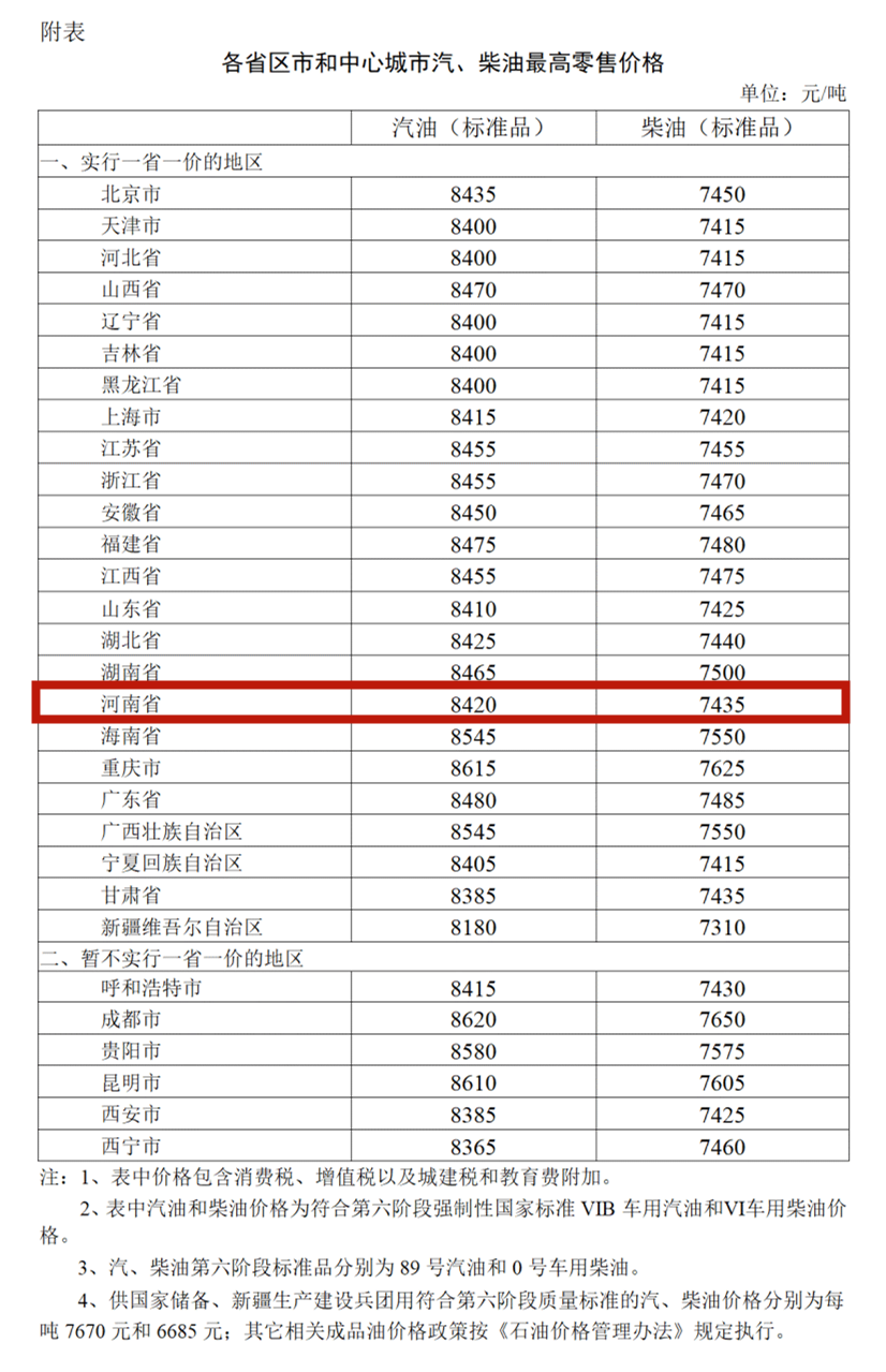 近期国际市场油价波动上升,根据1月20日的前10个工作日平均价格与上次调价前10个工作日平均价格对比情况,按照现行成品油价格机制,自1月20日24时起,国内汽、柴油价格(标准品,下同)每吨均上涨85元。调整后,各省(区、市)和中心城市汽、柴油最高零售价格见附表。 中石油、中石化、中海油三大公司及其他原油加工企业要组织好成品油生产和调运,确保市场稳定供应,严格执行国家价格政策。各地相关部门要加大市场监督检查力度,严厉查处不执行国家价格政策的行为,维护正常市场秩序。消费者可通过12315平台举报价格违法行为。 附:各省区市和中心城市汽、柴油最高零售价格 来源:国家发展改革委网站、新华社