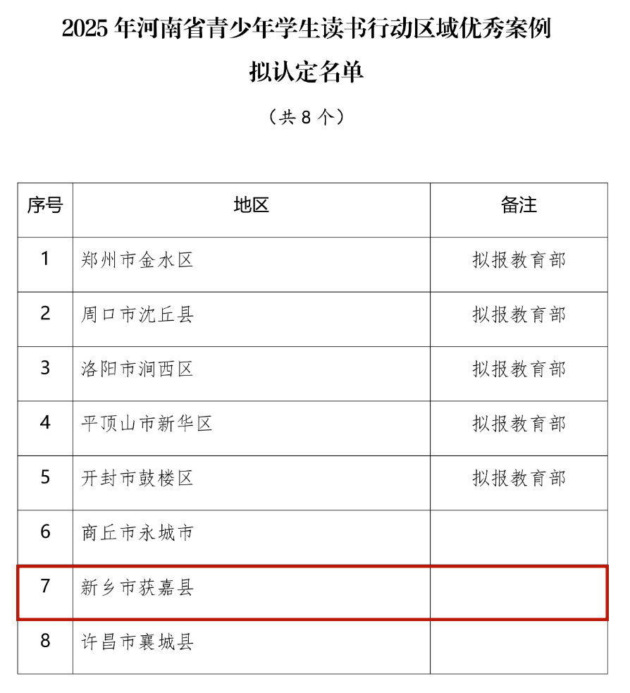 近日,河南省教育厅发布《关于2025年河南省青少年学生读书行动区域优秀案例和中小学“书香校园、书香班级”典型案例评选结果的公示》,其中,我市获嘉县拟认定为河南省青少年学生读书行动区域优秀案例,辉县市实